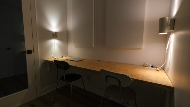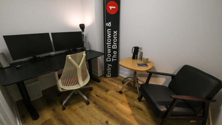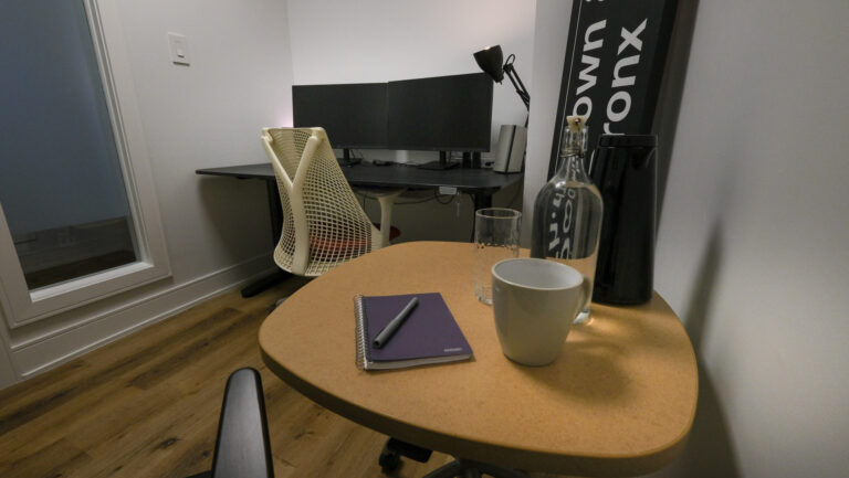 - Sit/stand desk with monitors, mouse, and keyboard provided